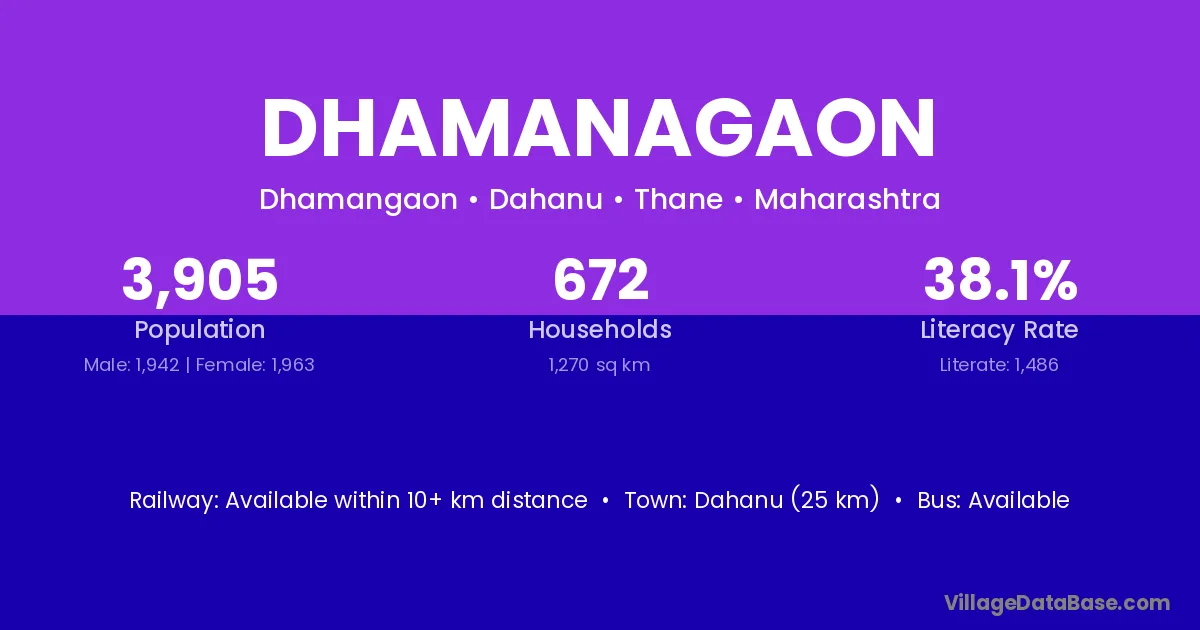Dahanu (25 km) is the nearest town to Dhamanagaon village for major economic activities and is located approximately 25 km away.