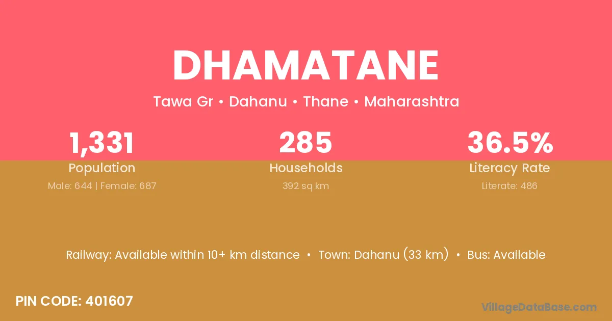 Dahanu (33 km) is the nearest town to Dhamatane village for major economic activities and is located approximately 33 km away.
