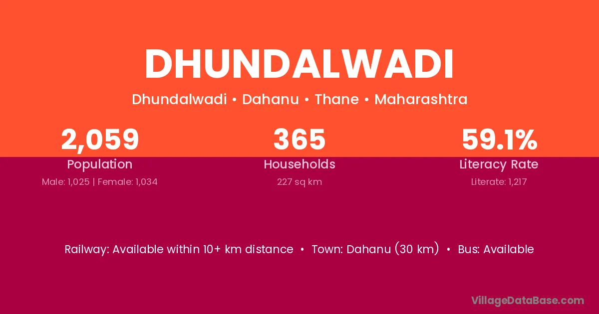 Dahanu (30 km) is the nearest town to Dhundalwadi village for major economic activities and is located approximately 30 km away.