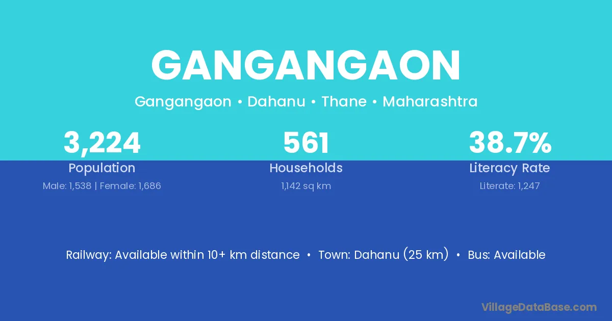 Dahanu (25 km) is the nearest town to Gangangaon village for major economic activities and is located approximately 25 km away.
