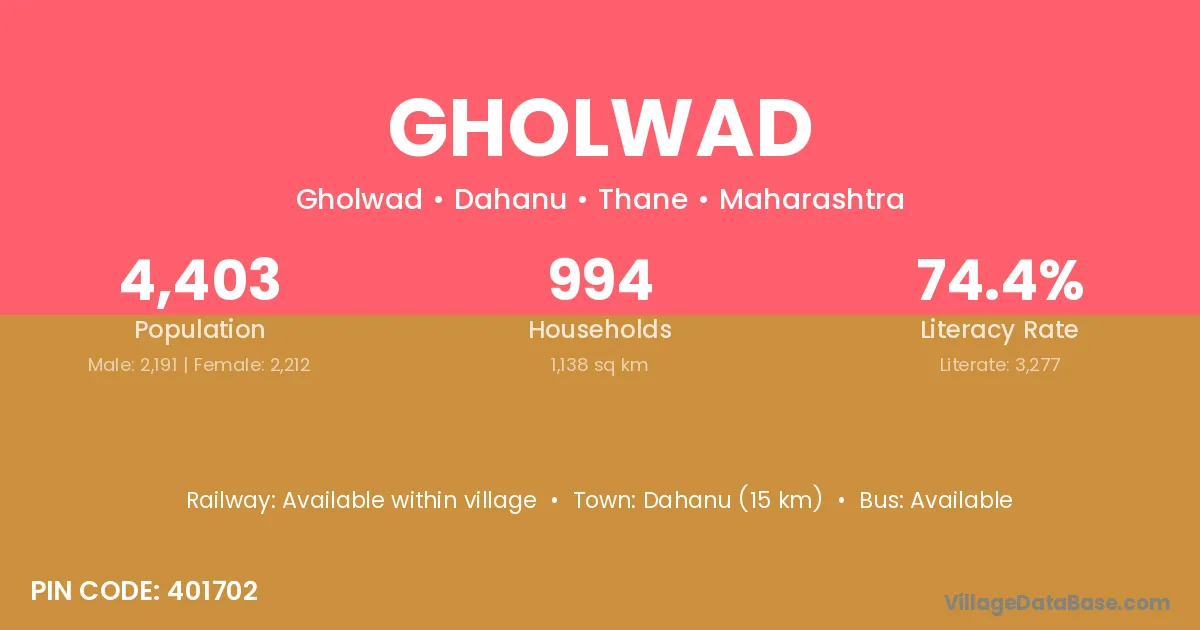 Dahanu (15 km) is the nearest town to Gholwad village for major economic activities and is located approximately 15 km away.