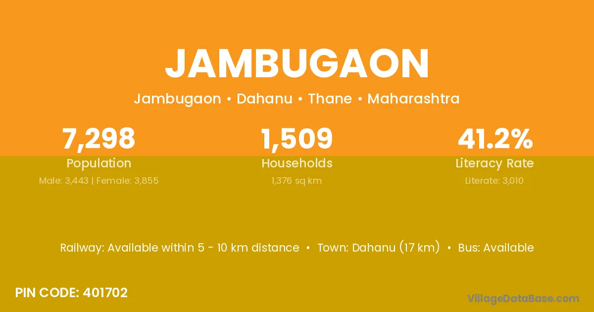 Dahanu (17 km) is the nearest town to Jambugaon village for major economic activities and is located approximately 17 km away.