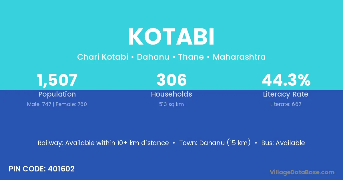 Dahanu (15 km) is the nearest town to Kotabi village for major economic activities and is located approximately 15 km away.