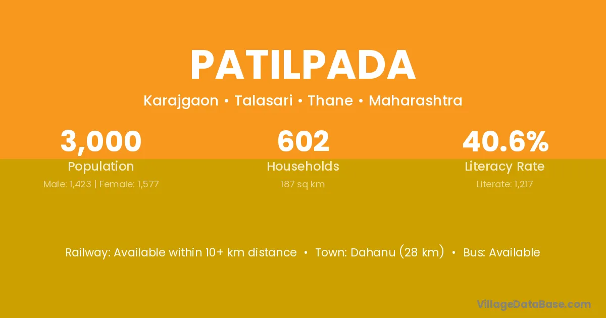 Dahanu (6 km) is the nearest town to Patilpada village for major economic activities and is located approximately 6 km away.