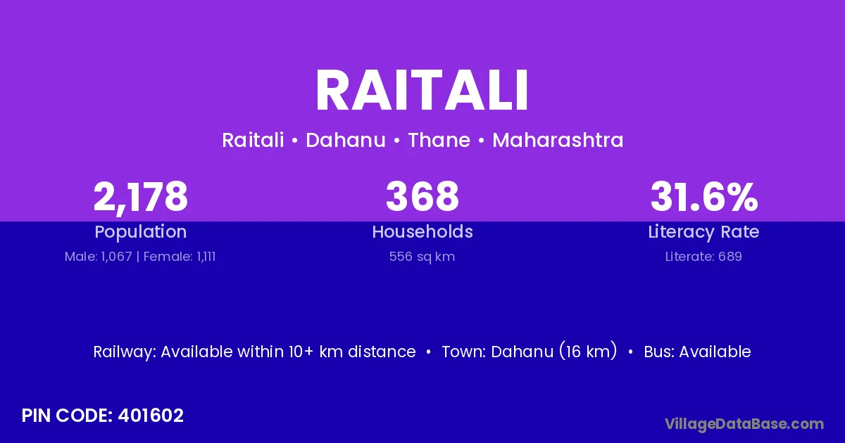 Dahanu (16 km) is the nearest town to Raitali village for major economic activities and is located approximately 16 km away.