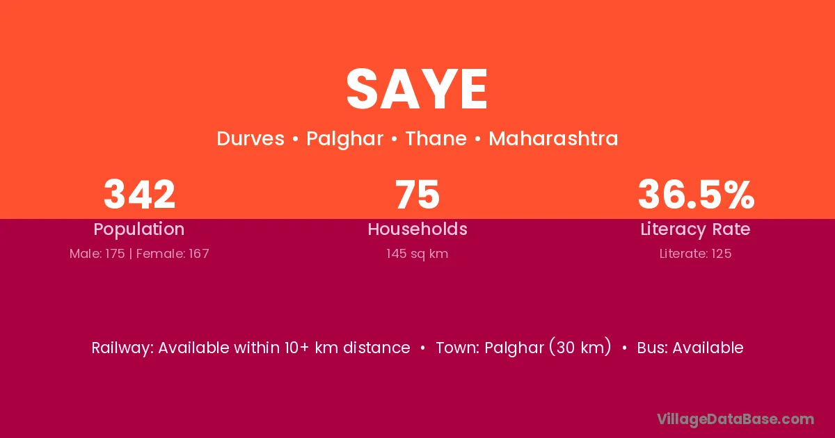 Dahanu (21 km) is the nearest town to Saye village for major economic activities and is located approximately 21 km away.