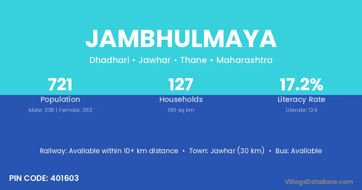 Jawhar (30 km) is the nearest town to Jambhulmaya village for major economic activities and is located approximately 30 km away.