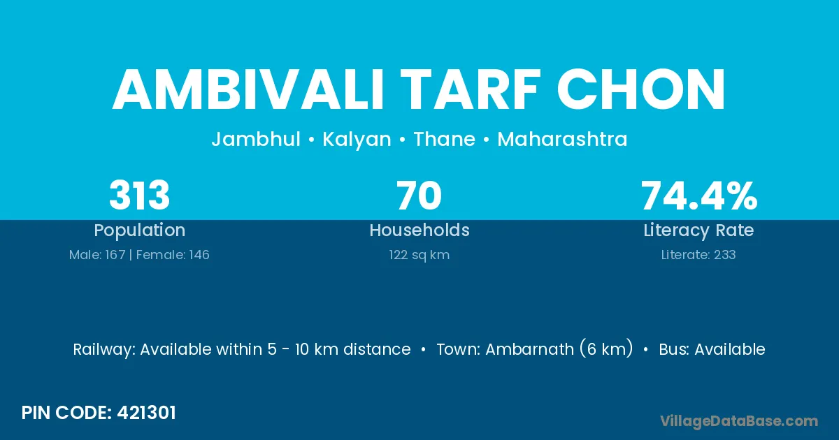 Ambarnath (6 km) is the nearest town to Ambivali Tarf Chon village for major economic activities and is located approximately 6 km away.