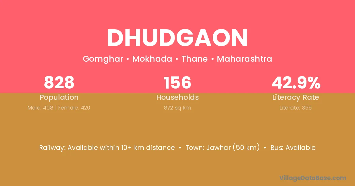 Jawhar (50 km) is the nearest town to Dhudgaon village for major economic activities and is located approximately 50 km away.