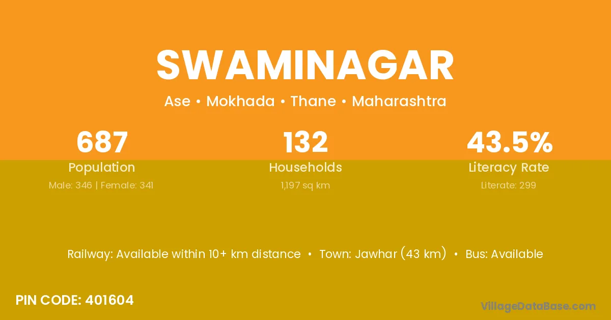 Jawhar (43 km) is the nearest town to Swaminagar village for major economic activities and is located approximately 43 km away.