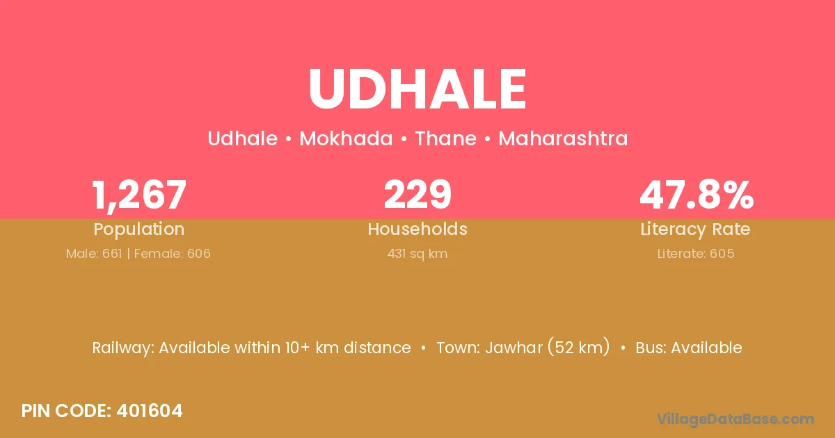 Jawhar (52 km) is the nearest town to Udhale village for major economic activities and is located approximately 52 km away.