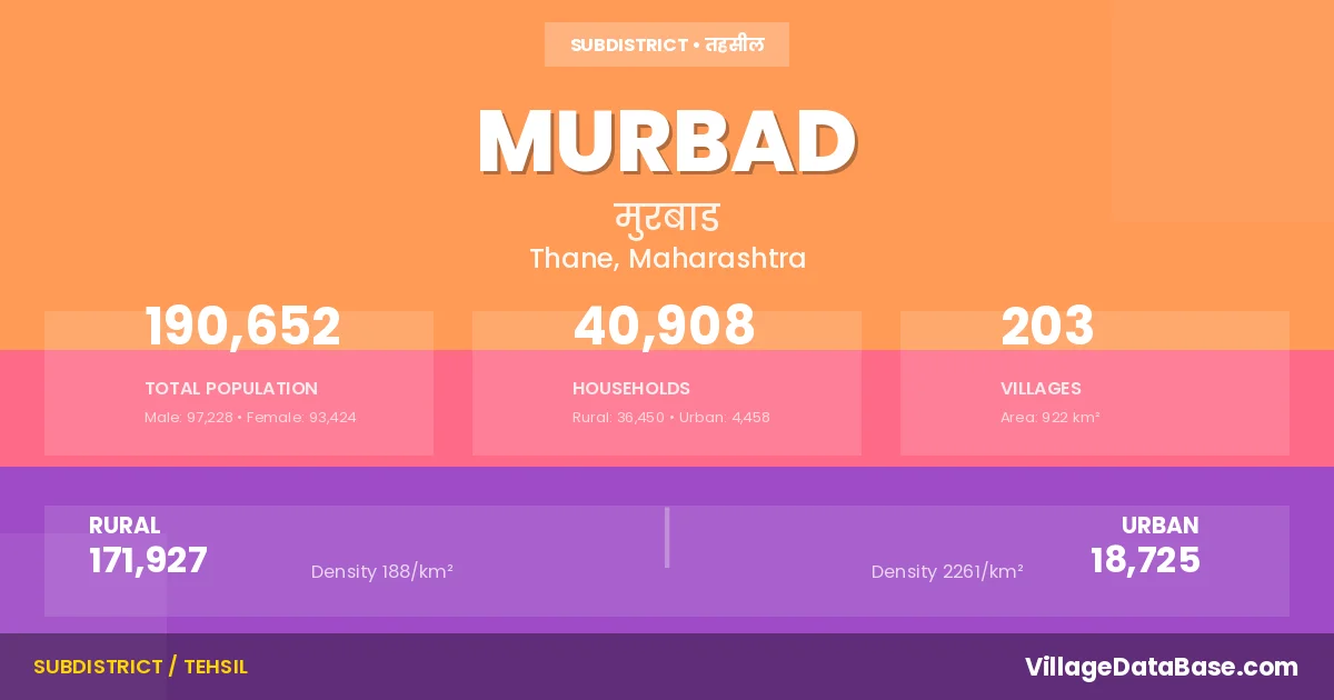 According to the 2011 census The total area of Murbad Tehsil is 922 km², with a population of 190652 people. The population density is 207 inhabitants per square kilometre, and there are approximately 40908 houses in the sub district.