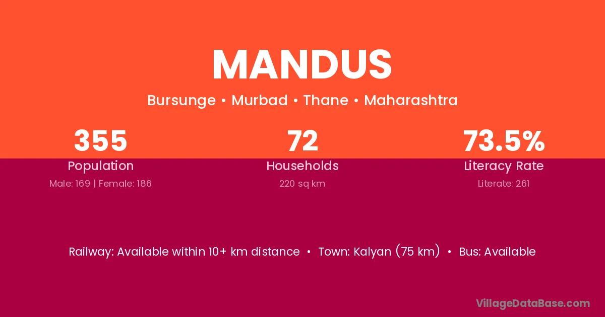 Kalyan (75 km) is the nearest town to Mandus village for major economic activities and is located approximately 75 km away.