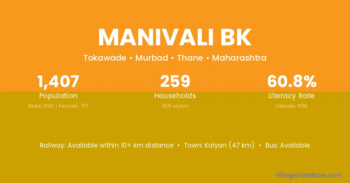 Kalyan (47 km) is the nearest town to Manivali Bk village for major economic activities and is located approximately 47 km away.