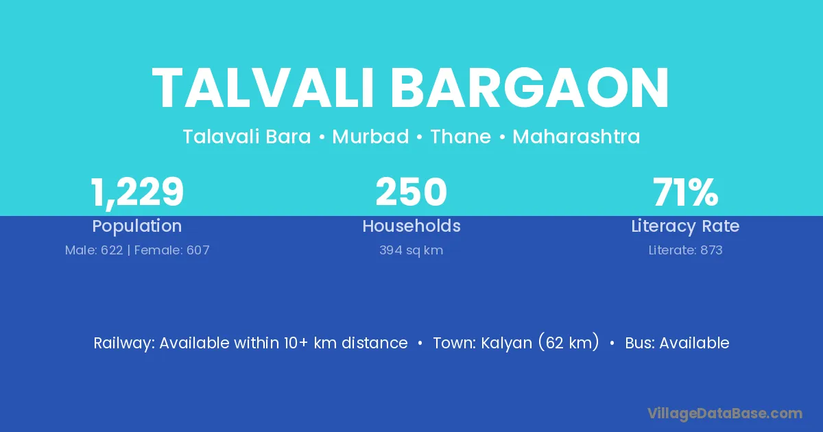 Kalyan (62 km) is the nearest town to Talvali Bargaon village for major economic activities and is located approximately 62 km away.
