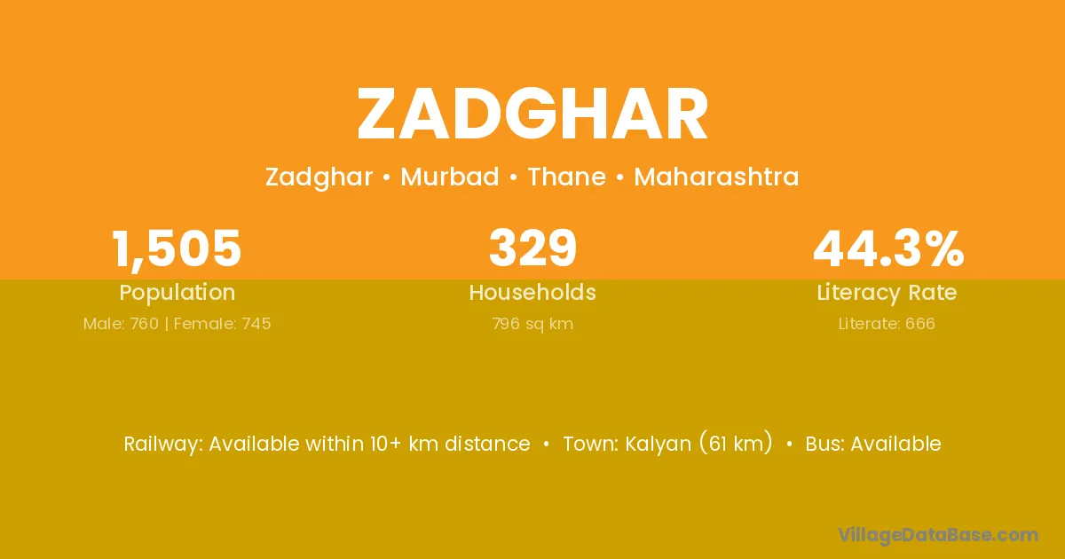 Kalyan (61 km) is the nearest town to Zadghar village for major economic activities and is located approximately 61 km away.