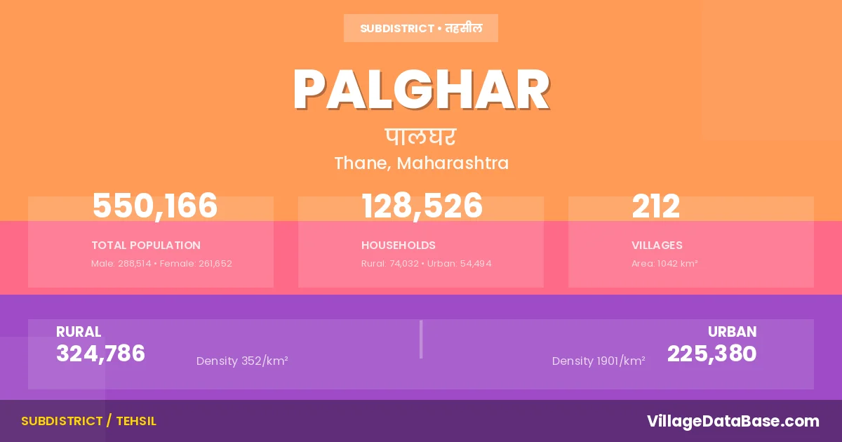 According to the 2011 census The total area of Palghar Tehsil is 1042 km², with a population of 550166 people. The population density is 528 inhabitants per square kilometre, and there are approximately 128526 houses in the sub district.