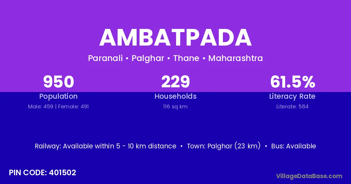 Ambatpada village has a total population of 950 people, of which 459 are males and 491 are females.