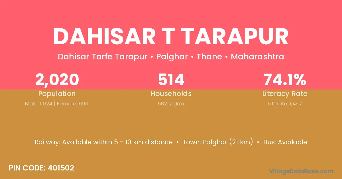Dahisar T Tarapur village has a total population of 2,020 people, of which 1,024 are males and 996 are females.