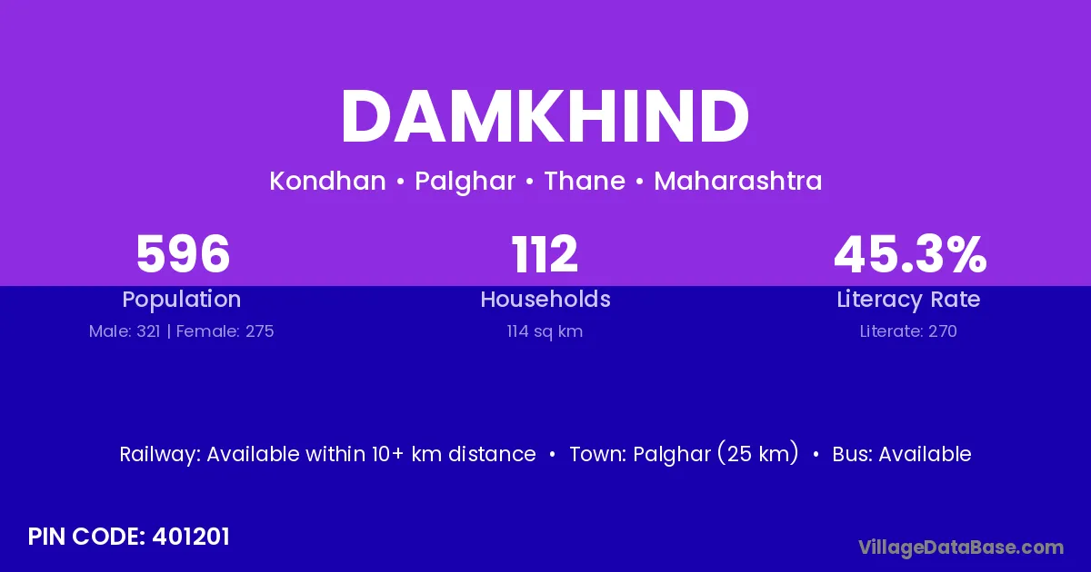 Palghar (25 km) is the nearest town to Damkhind village for major economic activities and is located approximately 25 km away.