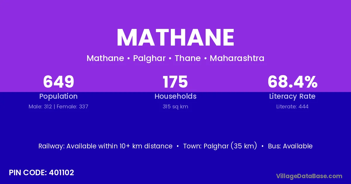 Palghar (35 km) is the nearest town to Mathane village for major economic activities and is located approximately 35 km away.