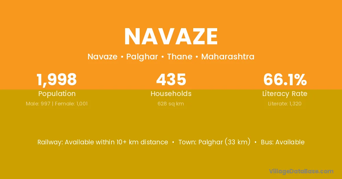 Palghar (33 km) is the nearest town to Navaze village for major economic activities and is located approximately 33 km away.