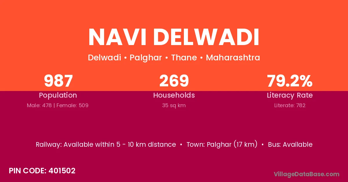 Palghar (17 km) is the nearest town to Navi Delwadi village for major economic activities and is located approximately 17 km away.