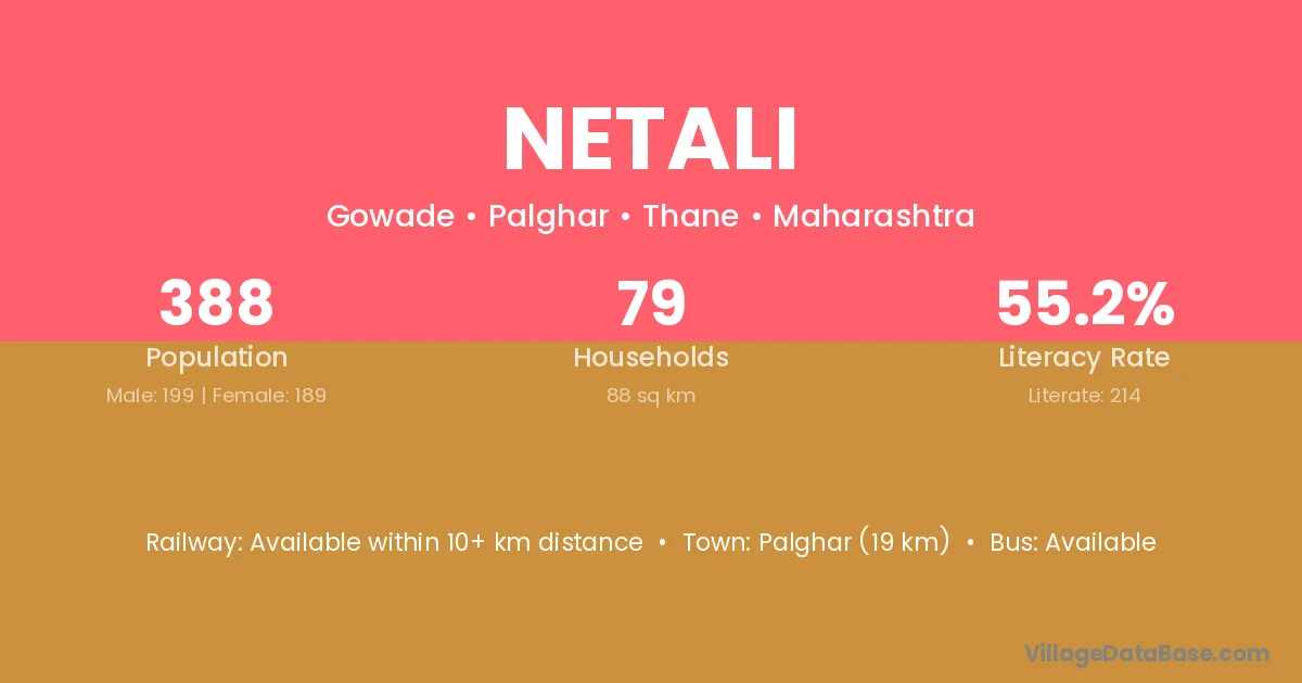 Palghar (19 km) is the nearest town to Netali village for major economic activities and is located approximately 19 km away.