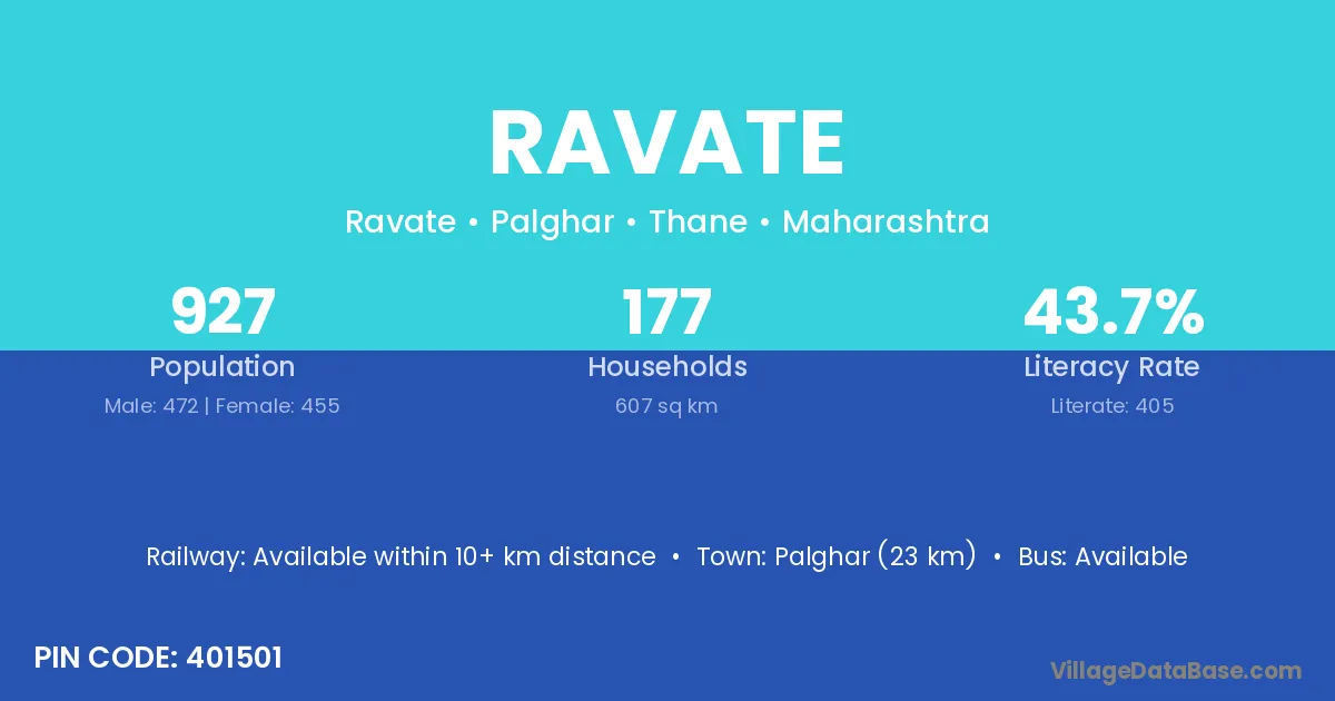 Palghar (23 km) is the nearest town to Ravate village for major economic activities and is located approximately 23 km away.
