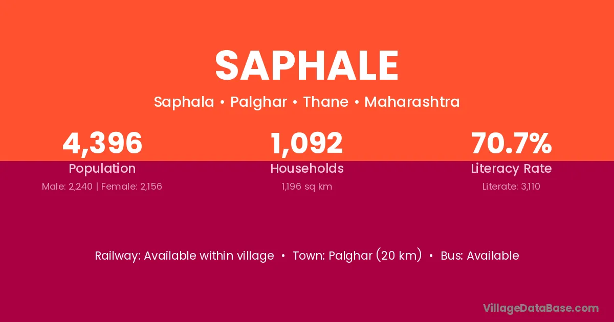 Palghar (20 km) is the nearest town to Saphale village for major economic activities and is located approximately 20 km away.