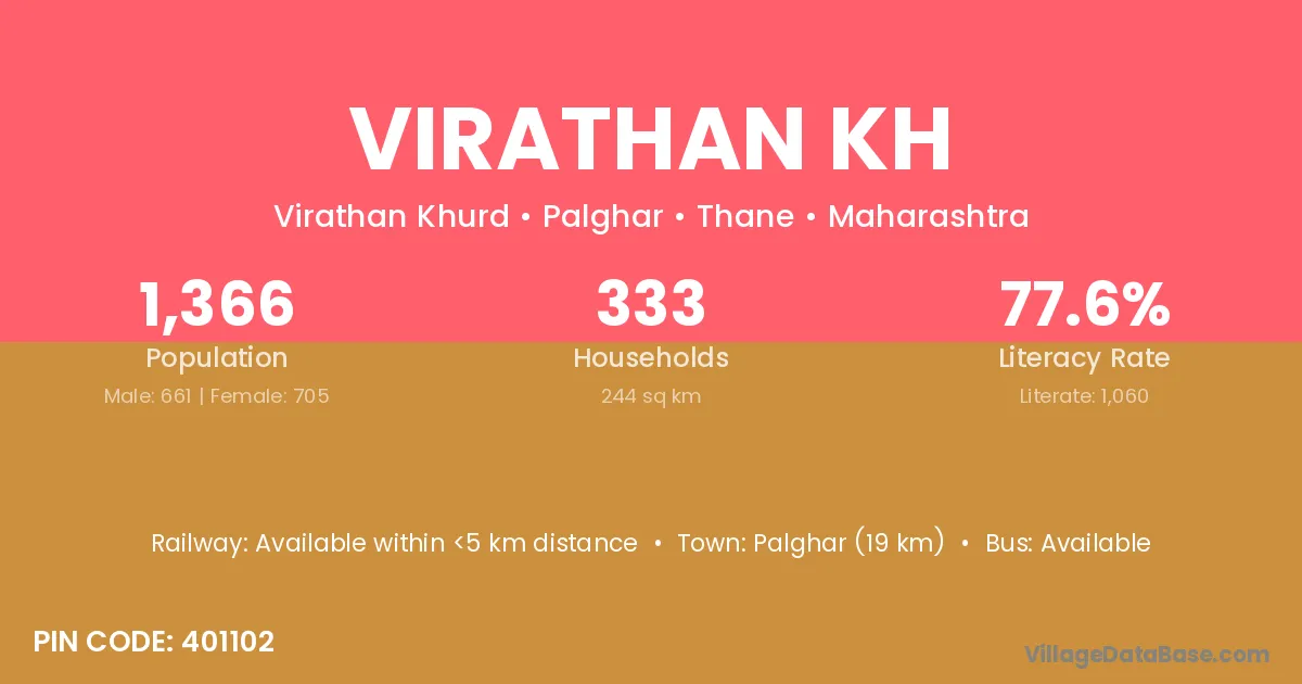 Palghar (19 km) is the nearest town to Virathan Kh village for major economic activities and is located approximately 19 km away.