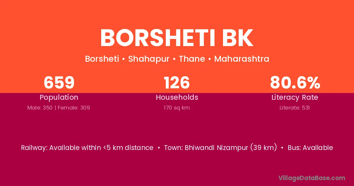 Borsheti Bk village has a total population of 659 people, of which 350 are males and 309 are females.