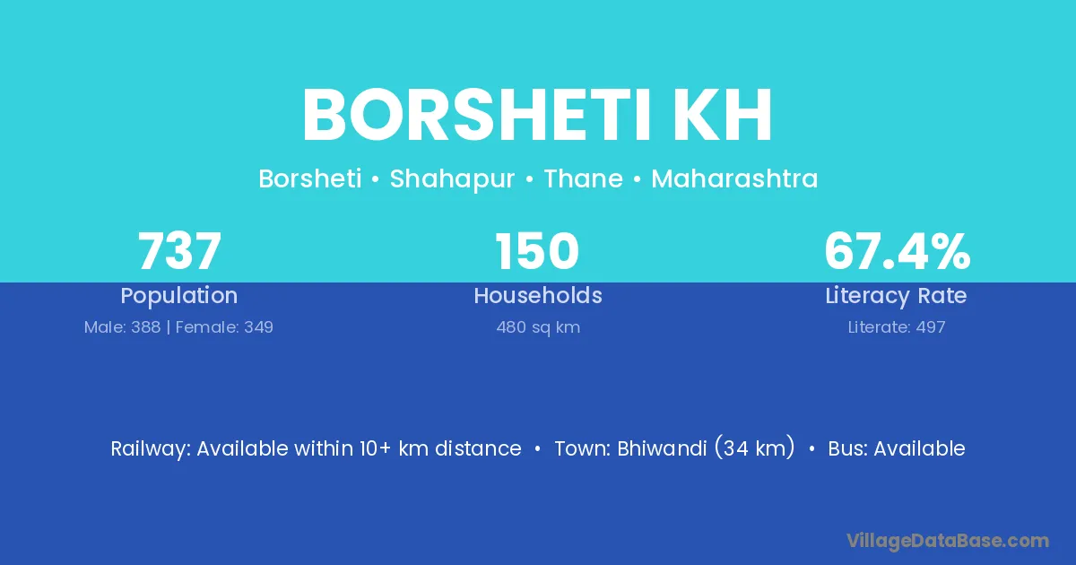 Bhiwandi (34 km) is the nearest town to Borsheti Kh village for major economic activities and is located approximately 34 km away.