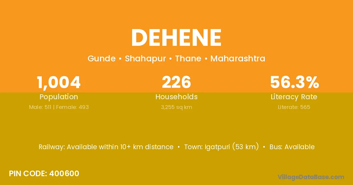 Igatpuri (53 km) is the nearest town to Dehene village for major economic activities and is located approximately 53 km away.