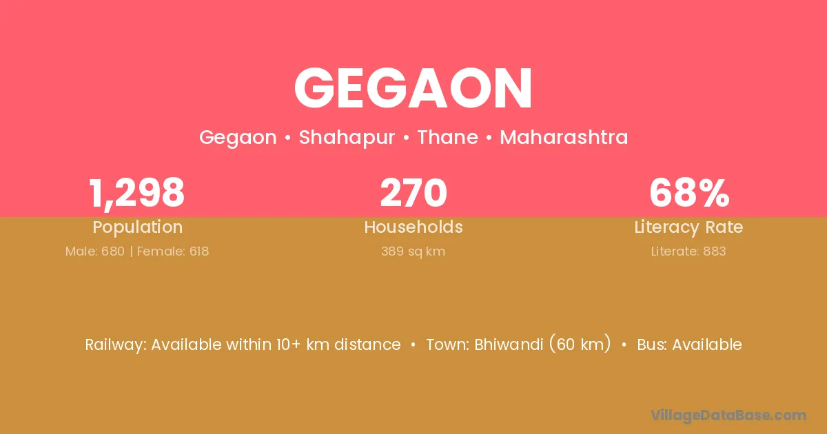 Bhiwandi (60 km) is the nearest town to Gegaon village for major economic activities and is located approximately 60 km away.