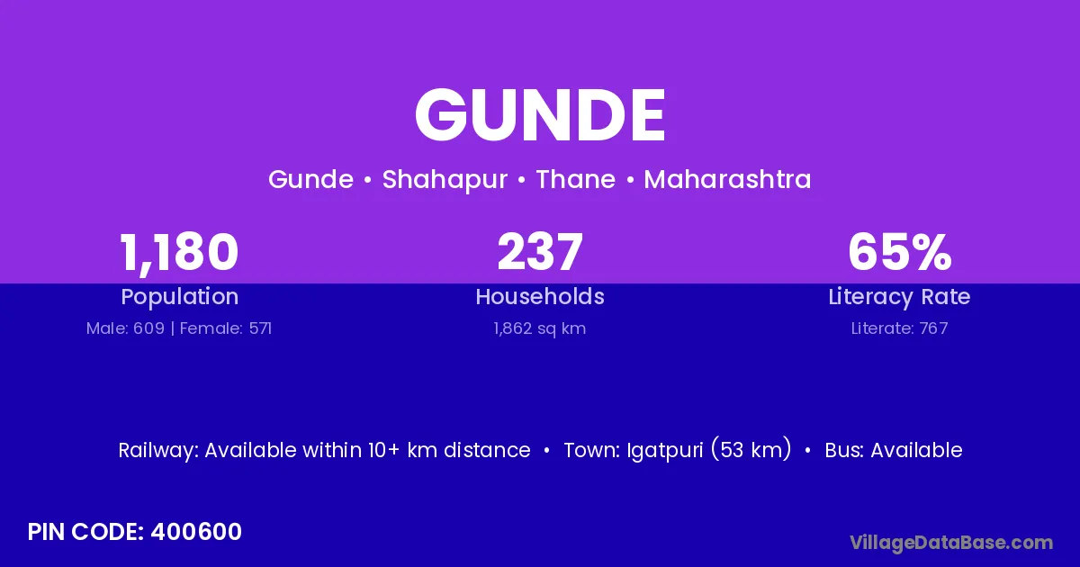 Igatpuri (53 km) is the nearest town to Gunde village for major economic activities and is located approximately 53 km away.