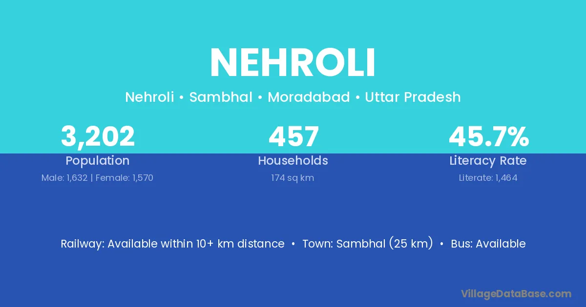 The literacy rate of Nehroli village is 62.29%. Male literacy stands at 74.38% and female literacy at 49.77%.