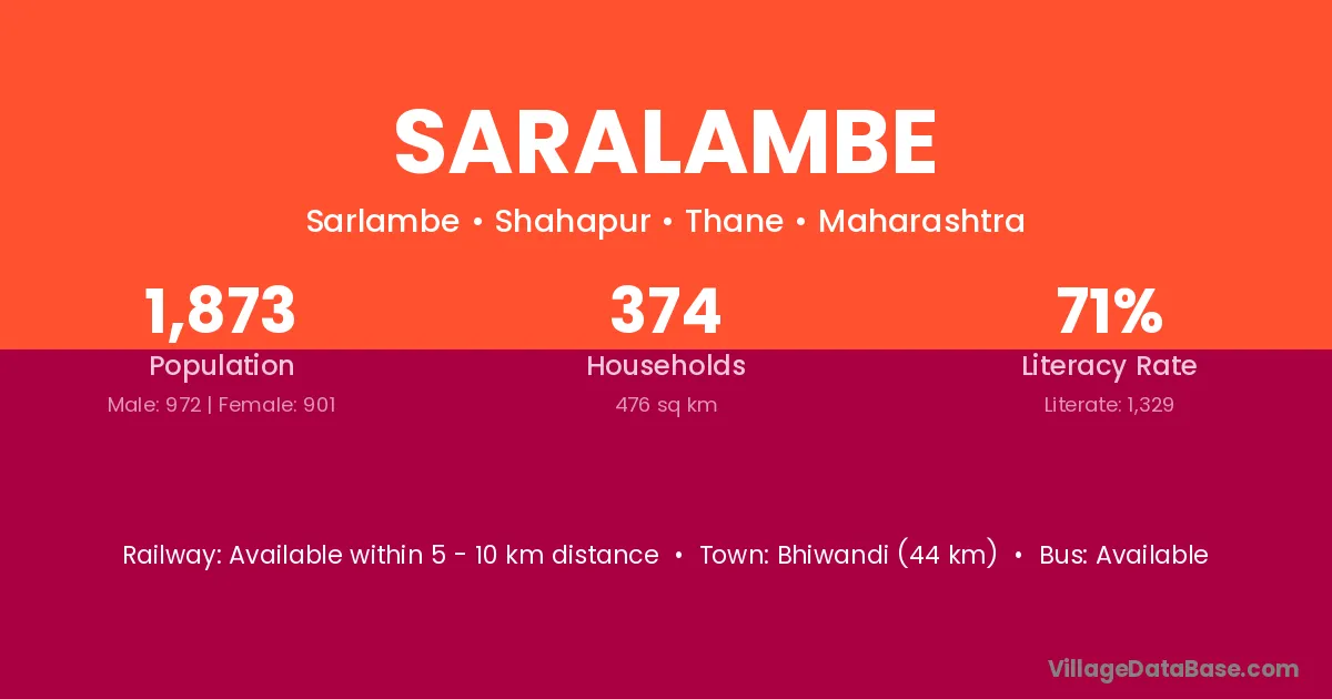 Bhiwandi (44 km) is the nearest town to Saralambe village for major economic activities and is located approximately 44 km away.