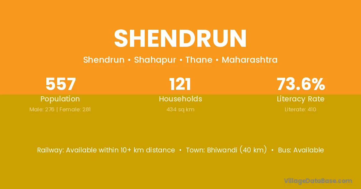 Bhiwandi (40 km) is the nearest town to Shendrun village for major economic activities and is located approximately 40 km away.