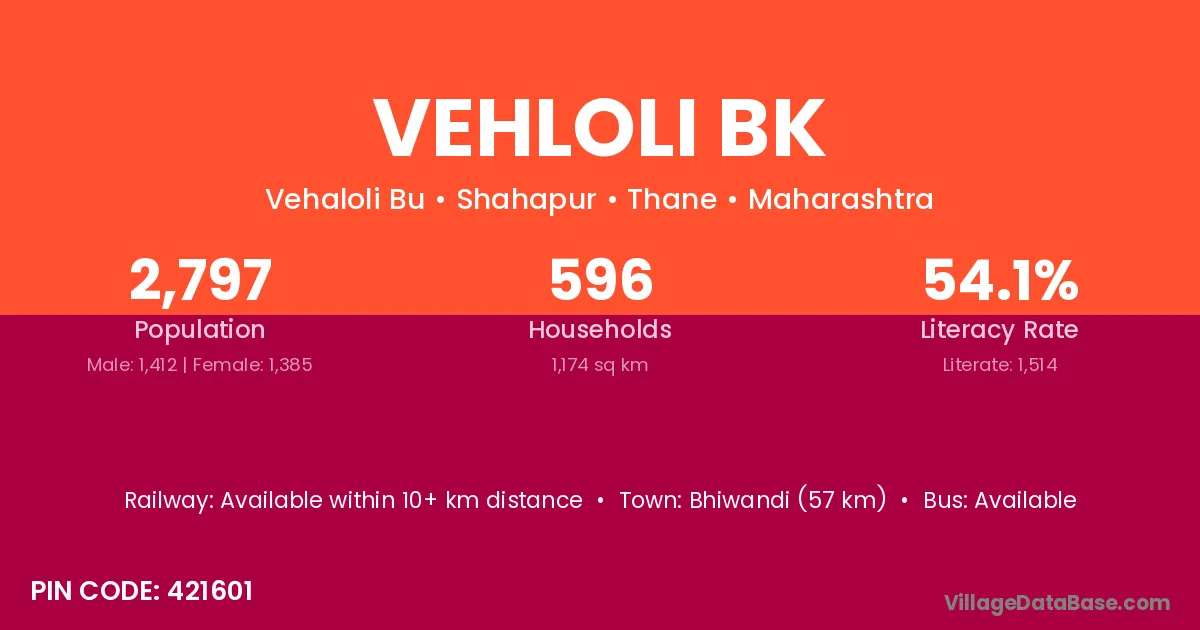 Bhiwandi (57 km) is the nearest town to Vehloli Bk village for major economic activities and is located approximately 57 km away.