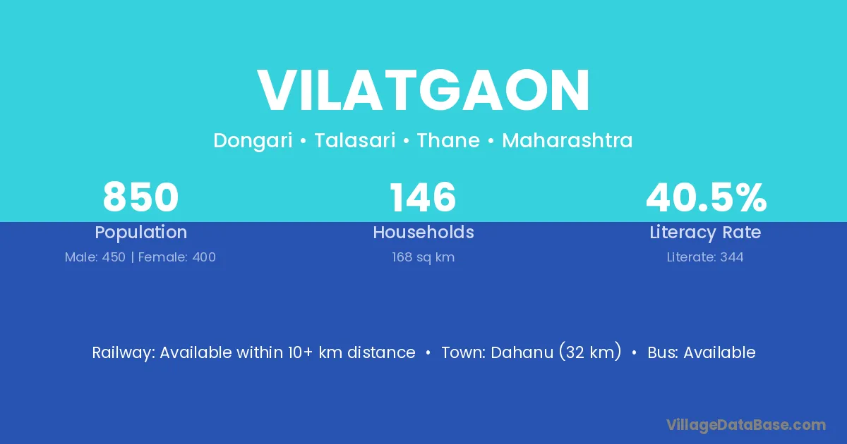 Dahanu (32 km) is the nearest town to Vilatgaon village for major economic activities and is located approximately 32 km away.
