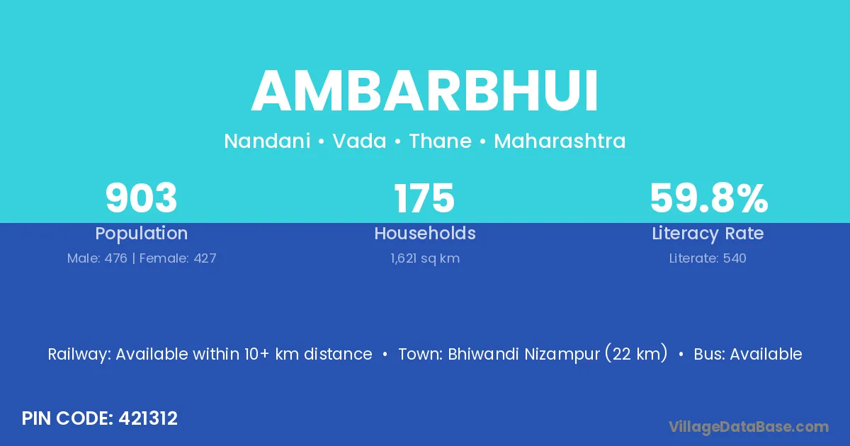 Bhiwandi Nizampur (22 km) is the nearest town to Ambarbhui village for major economic activities and is located approximately 22 km away.