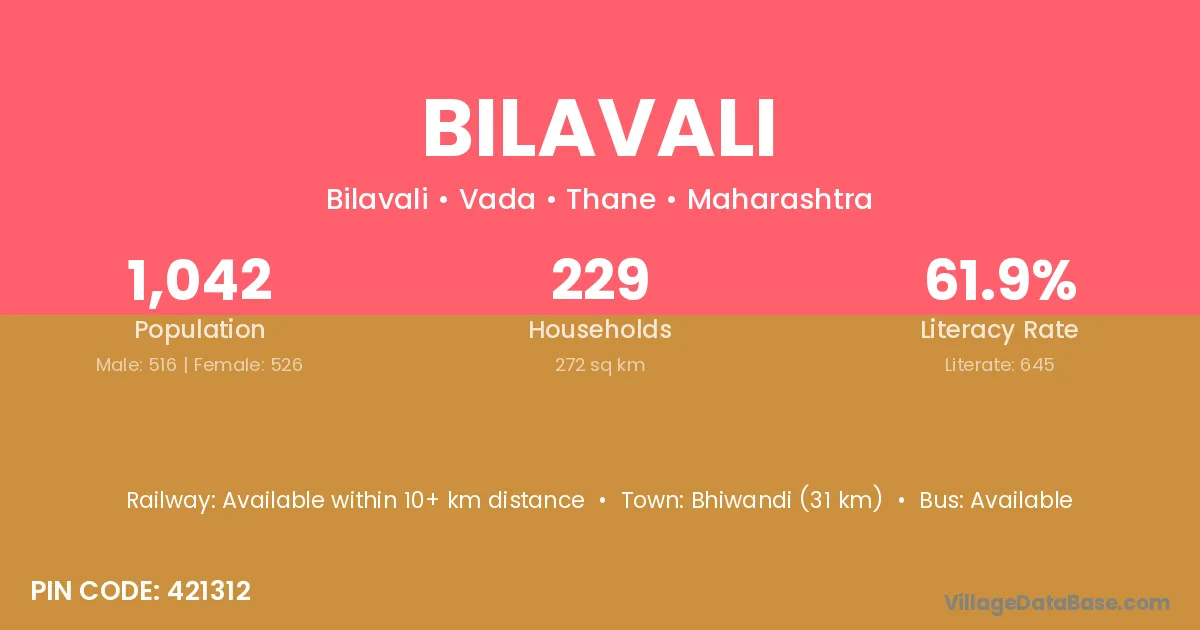 Bilavali village has a total population of 1,042 people, of which 516 are males and 526 are females.