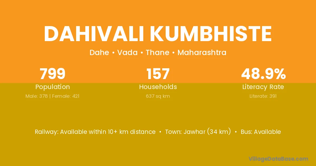 Jawhar (34 km) is the nearest town to Dahivali Kumbhiste village for major economic activities and is located approximately 34 km away.