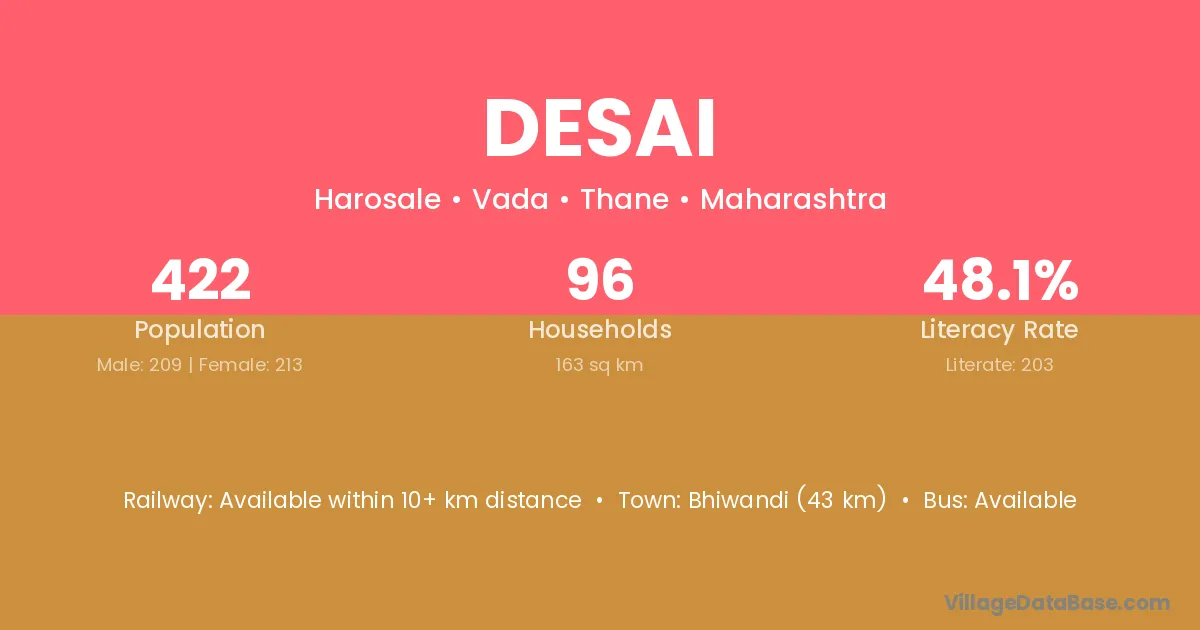 Bhiwandi (43 km) is the nearest town to Desai village for major economic activities and is located approximately 43 km away.