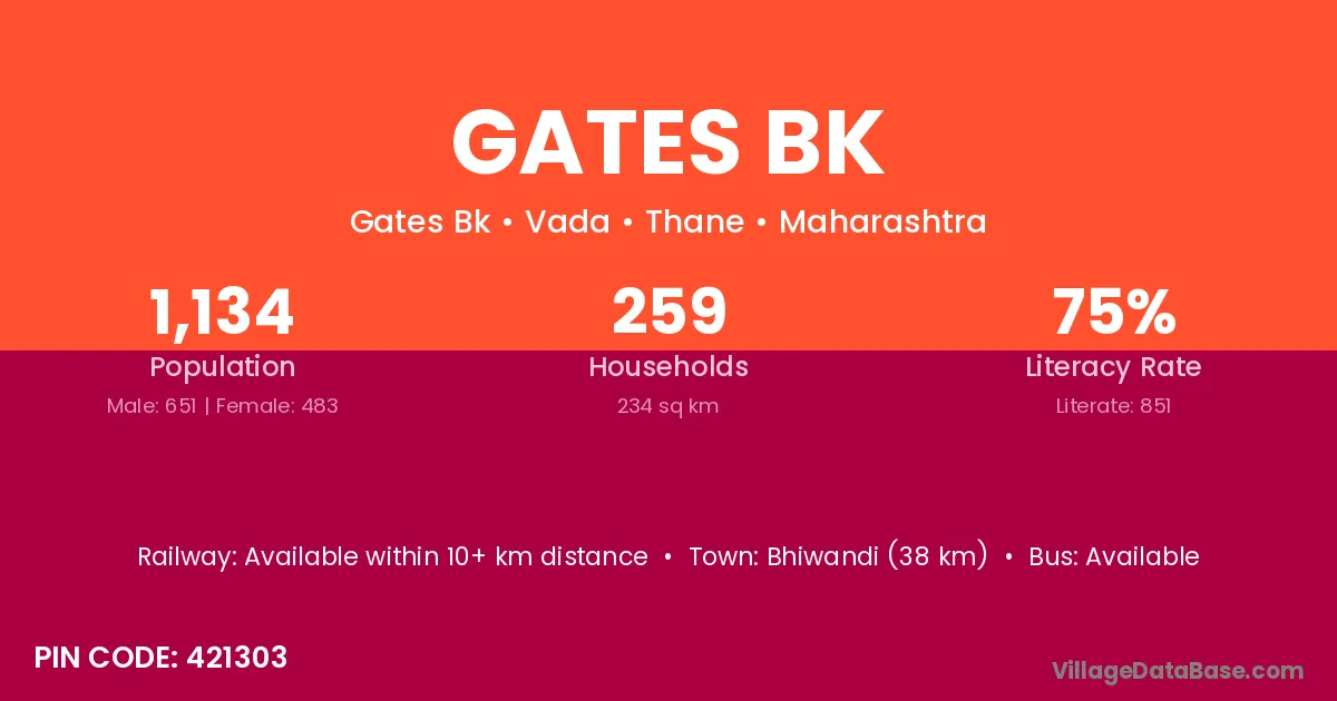 Bhiwandi (38 km) is the nearest town to Gates Bk village for major economic activities and is located approximately 38 km away.