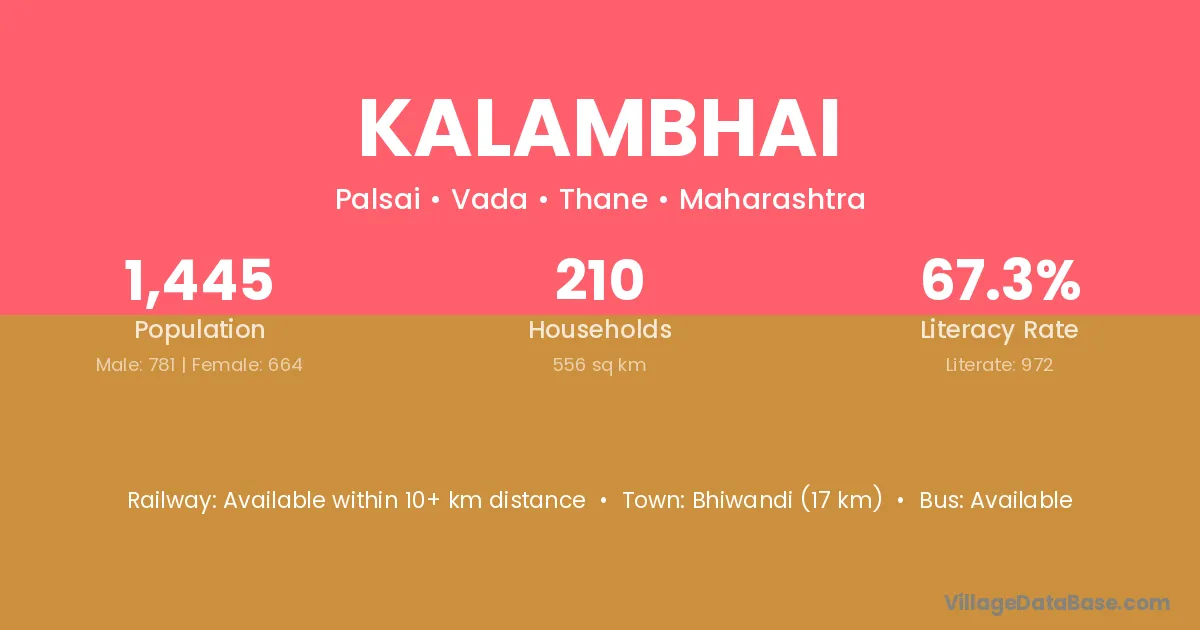 Bhiwandi (17 km) is the nearest town to Kalambhai village for major economic activities and is located approximately 17 km away.