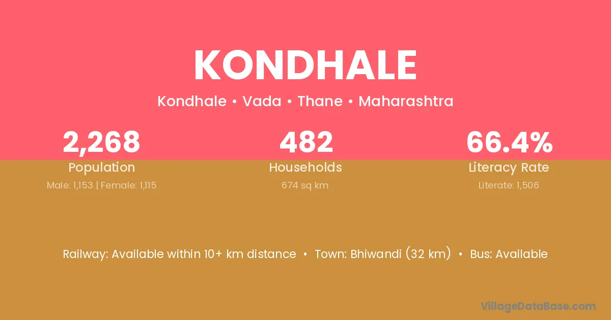 Bhiwandi (32 km) is the nearest town to Kondhale village for major economic activities and is located approximately 32 km away.