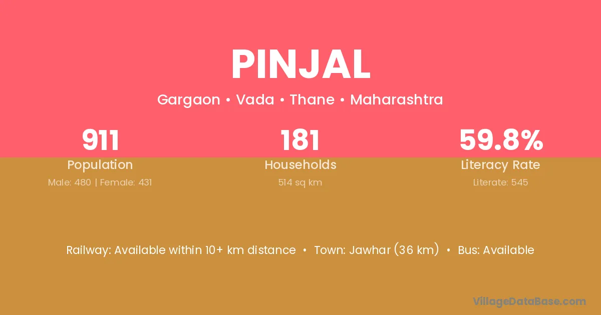 Jawhar (36 km) is the nearest town to Pinjal village for major economic activities and is located approximately 36 km away.