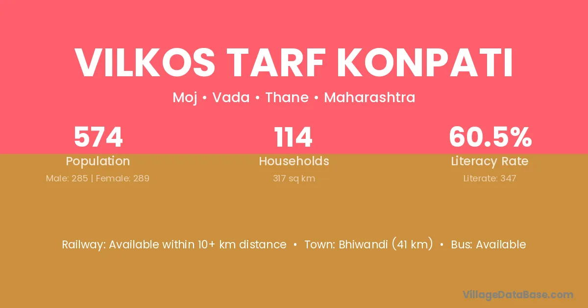 Bhiwandi (41 km) is the nearest town to Vilkos Tarf Konpati village for major economic activities and is located approximately 41 km away.
